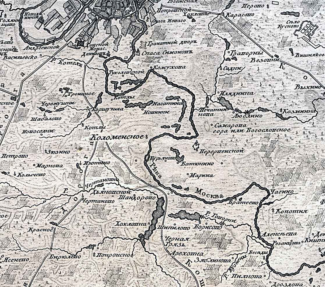Окрестности Коломенского по «Плану Царствующего Града Москвы с показанием лежащих мест на тридцать верст вокруг» 1766 г.
