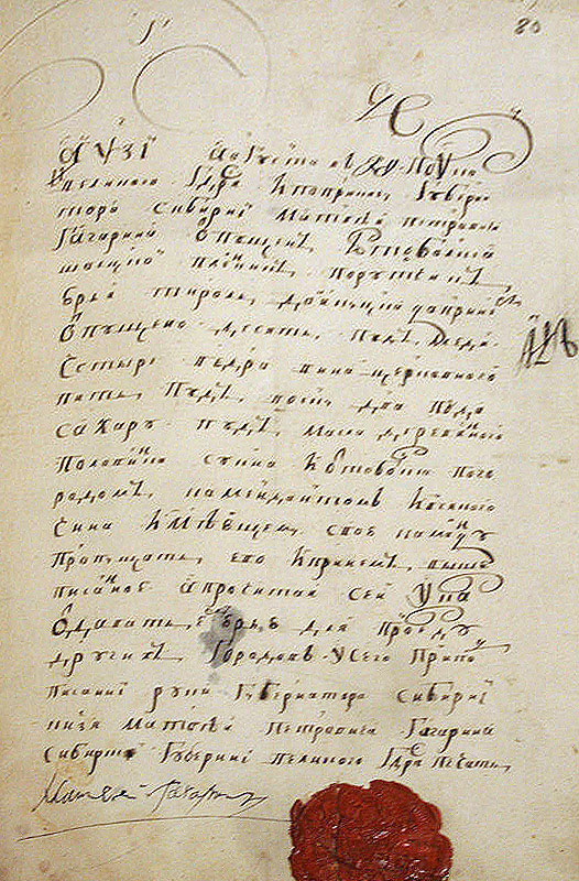 1717 г. августа 29. Проезжий лист, данный сибирским губернатором кн. М. П. Гагариным шведскому пленнику поручику Юрию Тиролю, отпущенному из Тобольска для доставки в Якутск меда, церковного вина, воска, сахара, "масла деревянного" и сукна. Подпись-автограф М. П. Гагарина. Печать Сибирского царства. Экспозиция выставки Выставочного зала Федеральных архивов «Губернии в России при Петре Великом» (2008-2009 гг.).