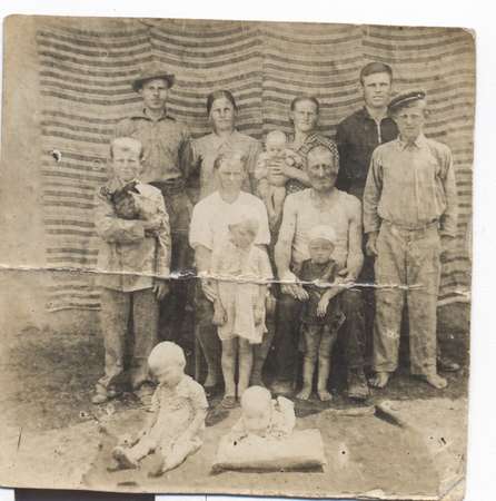 Второй ряд: Анастасия Петровна, Виктор Васильевич, за спиной дочь Раиса( моя будущая бабушка), Сестра Виктора Васильевича, и еще двое его маленьких детей.