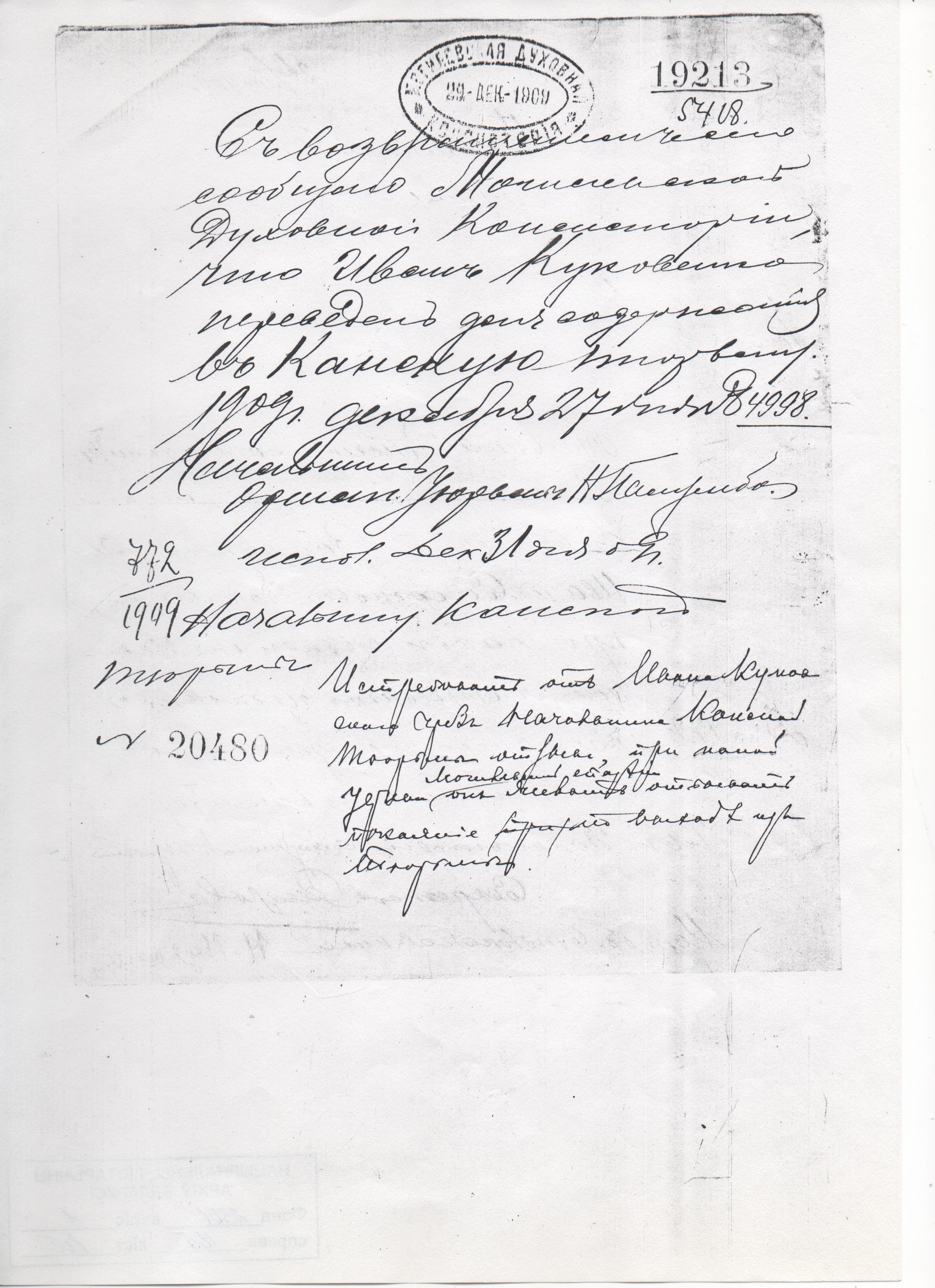 С возвращением сего сообщаю Могилевской Духовной Консистории, что Иван Куковенко переведен для содержания в Канскую тюрьму.