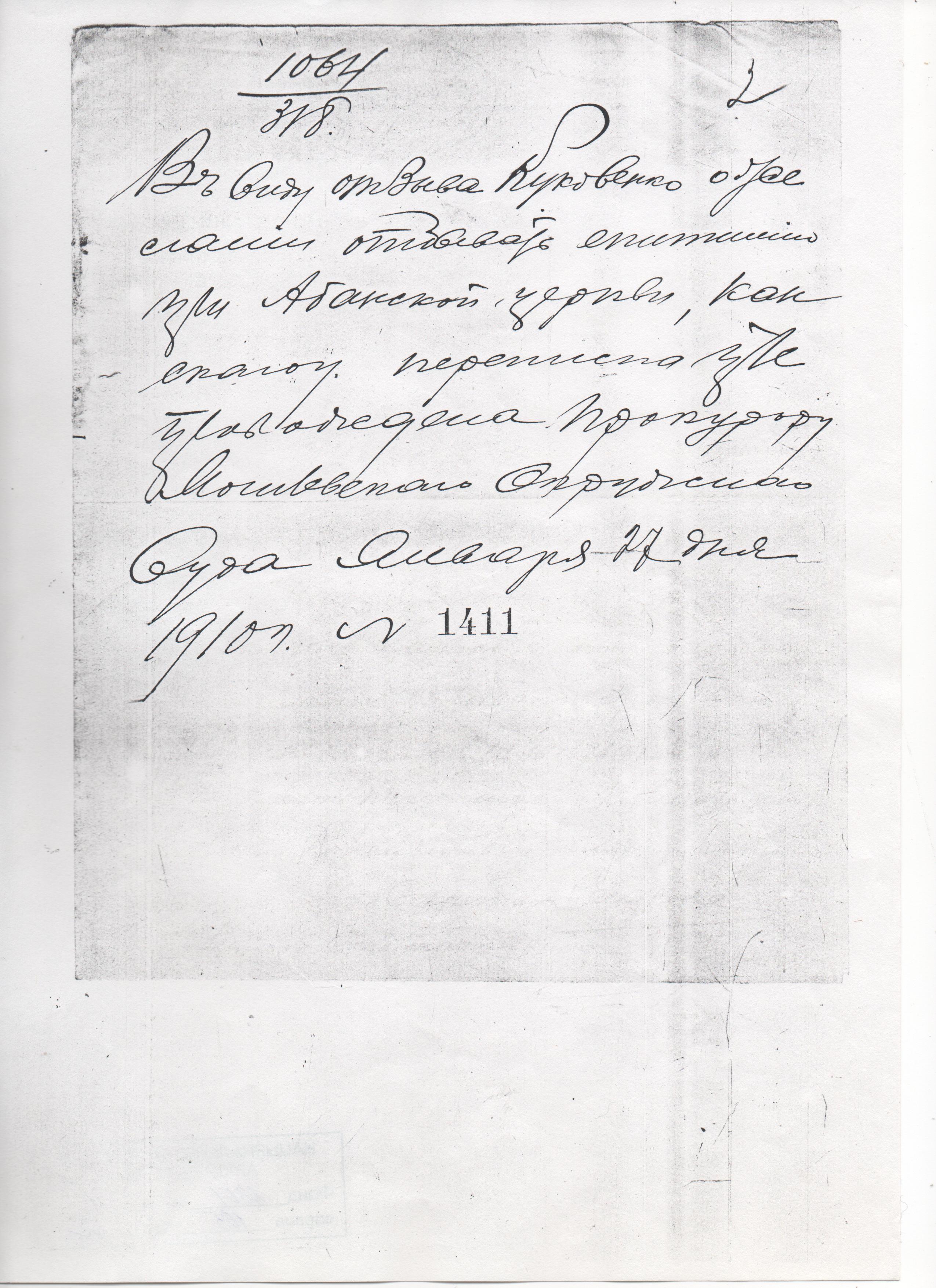 В виду отзыва Куковенко о желании отбывать епитимию при Абанской церкви Канского у. переписка препровождена Прокурору Могилевского Окружного Суда января 27 дня 1910 г.