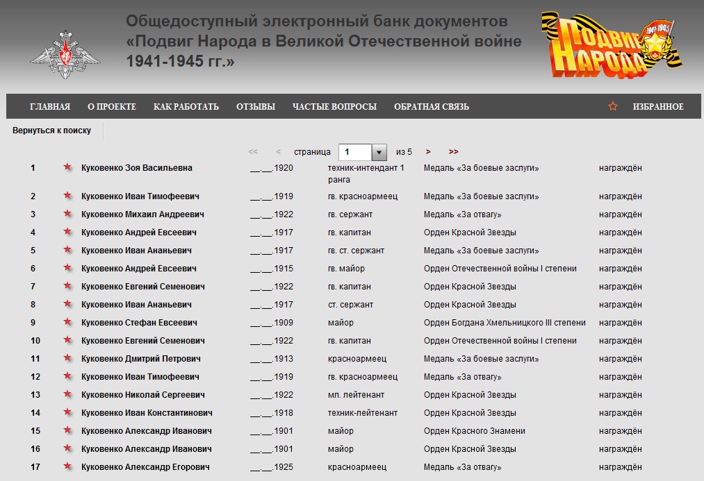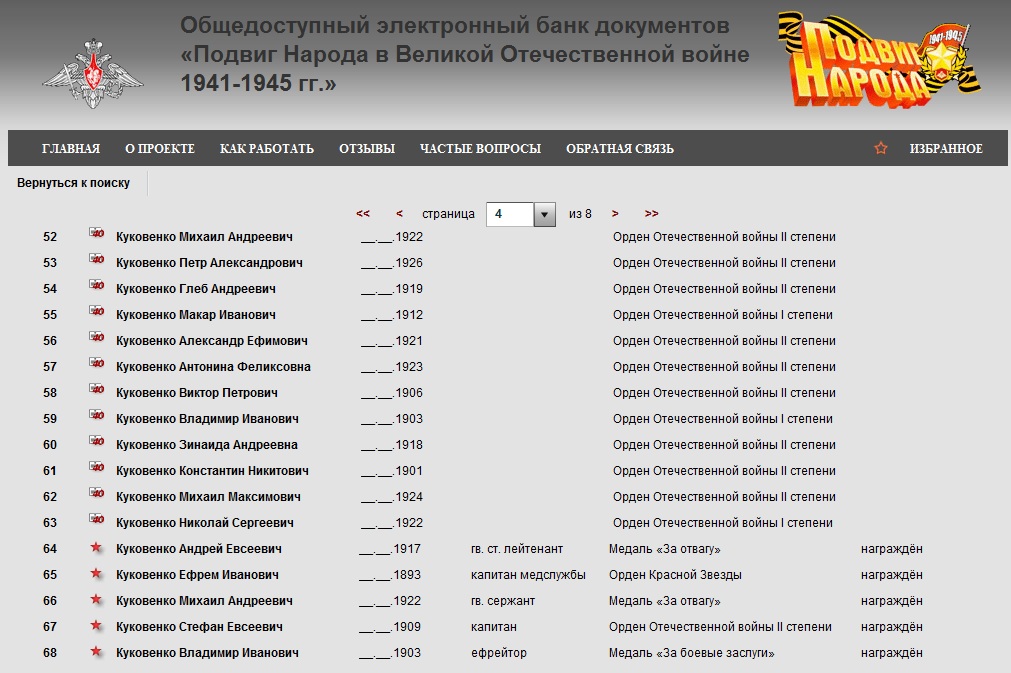 С особым чувством гордости и признательности за провленное мужество и доблесть помещаю список кавалеров боевых наград, моих родственников, награжденных орденами и медалями за участие в Великой Отечественной Войне. Род Куковенко честно выполнил свой ратный долг перед Родиной.
