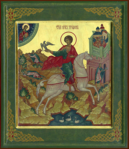 «Св. мученик Трифон жил близ г. Апамеи во Фригии. За свою святую жизнь он получил от Бога благодать исцеления. Помогая всем страждущим, св. Трифон требовал одной платы – веры в Иисуса Христа, благодатью которого он исцелял их. Святой был схвачен за проповедование Христа и подвергнут жестоким истязаниям. В Никее, при епархе Анатолии Аквилине, он был приговорен к смерти, но скончался на месте казни прежде, чем его коснулся меч. Это произошло в 250 г. (Св. мученику Трифону молятся об избавлении от гусениц, вредящих садам, полям и огородам; также о помощи в различных скорбях, а невесты – о счастливом браке) - Согласно житию, Трифон (имя это в переводе с греческого означает «живущий в роскоши», «изнеженный») был во Фригии простым крестьянином. С малых лет он помогал родителям по хозяйству — пас гусей (видимо, поэтому в прежние времена российский сельский люд и величал его Трифоном-гусятником). И «уже от младенчества был избран для Царства Небесного» (Журнал Московской патриархии, 1962, № 2) и посему с юных лет стал «распространителем христианской веры, ослушником царской воли (то есть воли императора. — А. Ш.) и презрителем богов». Презритель — от глагола «презирать», что значит, согласно словарю Даля, пренебрегать, считать ничтожным, подлым, недостойным внимания, ниже всякого уважения. Вот именно так, точнее и не скажешь, фригиец Трифон как истинный ревностный христианин относился к богам римского пантеона, ко всяким языческим идолам. И, разумеется, это ему даром не прошло.