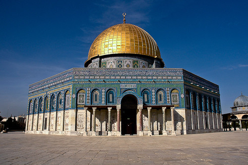* Мечеть Омара (более правильно Куба ас- Сахра, или Купол скалы) стоит на месте древней еврейской святыни – храма Соломона. На этом же месте в начале нашей эры царь Ирод возвел великолепный и обширный храм, но простоял он не долго. После захвата Иерусалима императором Титом, храм Ирода был разрушен и несколько веков лежал в развалинах. В 638 году халиф Омар отвоевал Иерусалим у Византии и повелел очистить святое место и скалу, которая там находится. В 685-691г.г., по велению халифа Абд аль- Малика ибн Мирвана, над скалой была построена мечеть Куба ас-Сахра, которая вскоре стала одним из священных мест мусульманского мира. Каждый четверг и пятницу служители мололи шафран, смешивали его с мускусом, амброй и розовой водой и оставляли этот состав настаиваться до понедельника, чтобы им протереть скалу, размеры которой довольно внушительны: 17 метров в длину, 13 – в ширину, 3- в высоту. После этого в мечеть разрешалось входить мусульманам, и те, как в Мекке перед Каабой, несколько раз с молитвой обходили священный камень. Столь трепетное отношение к этой скале объясняется тем, что по библейским преданиям, с которыми согласен и Коран, на этой скале Авраам собирался принести в жертву своего сына Исаака, но был удержан ангелом. По преданию с этой скалы вознесся на небо пророк Мухаммед, оставив на камне отпечаток своей ноги, который сохраняется как величайшая святыня. Крестоносцы захватили Иерусалим в 1099 году и почти сто лет владели им. Они превратили мечеть в храм, установили на священной скале алтарь, у входа в мечеть – статую Христа, а над куполом водрузили золотой крест.