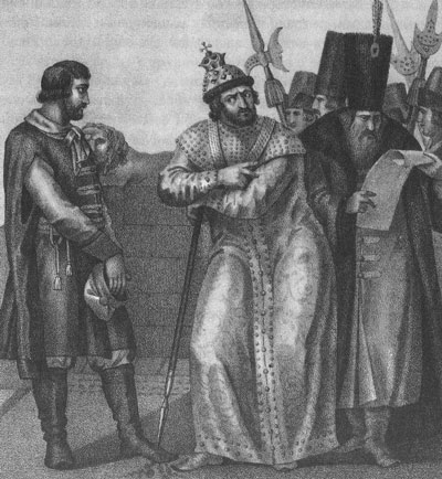 Василий Шибанов подал от господина своего Андрея Курбского письмо царю Иоанну IV. 1564 год. Гравюра Б. Чорикова. XIX в.
