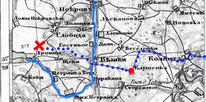 На карте я провел циркулем две дуги - одну радиусом 18 км (от Царева Займища), другую радиусом 36 км (от Колоцкого монастыря). И эти дуги даже не пересеклись друг с другом - они аккуратно соприкоснулись в точке, удаленной на юг от Клушина примерно на 25 км, немного восточнее нынешней деревни Никольское. К тому же оказалось, что Никольское лежит строго на прямой линии, соединяющей Колоцкое и Царево Займище.