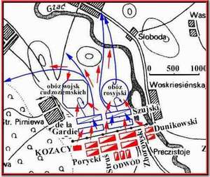 многочасовое сражение, во время которого поляки многократно то наступали, то отступали от русских позиций – примерно 10-15 км;