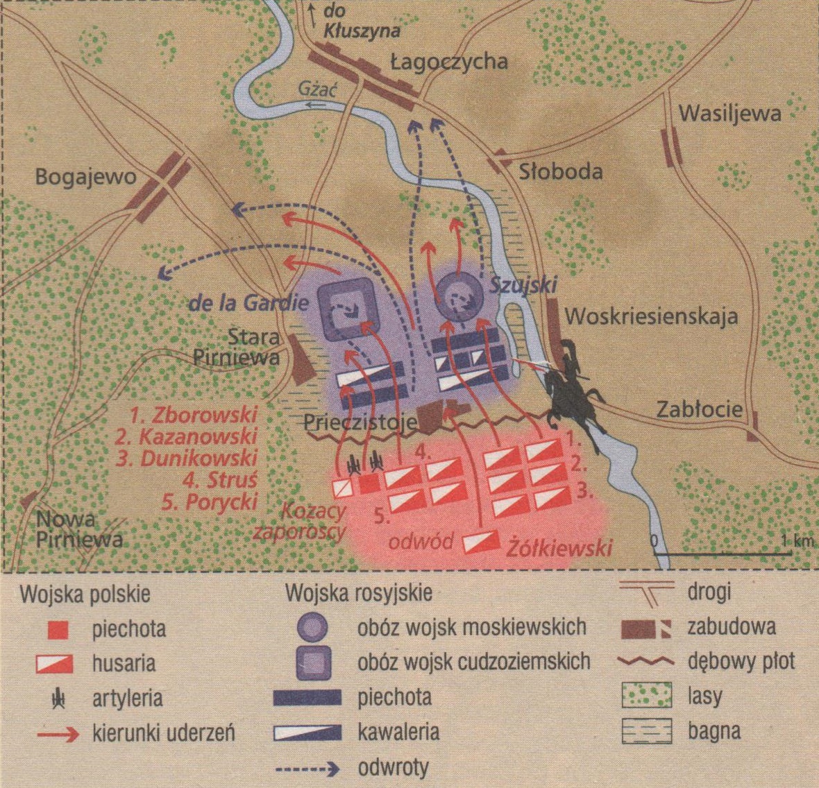 Не было никаких отклонений в маршруте русской армии далеко на север - армия двигалась по наиболее короткой дороге в сторону Царева Займища. Не было и сверх марафонских дистанций – и русские, и поляки совершили перед битвой, хотя и напряженные, но вполне реальные переходы.