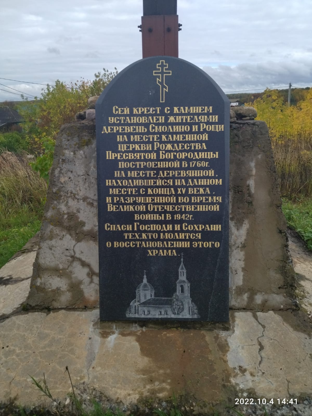 4 октября 2022 г. я посетил Смолино, где сделал несколько фотографий. Господский дом не сохранился, разркшена и старинная церковь Рождества Богородицы. На ее месте сейчас стоит памятный крест и часовня.