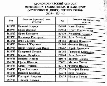 Таможенный голова обычно был и головою кабацким, т.е. лицом, заведовавшим кабацкими сборами. Кабацкие головы и их целовальники производили постройку и починку кружечных дворов, винокурение, варение пива и меда, хранение и продажу напитков, преследовали кормчество, в известных случаях разрешали частным лицам курить вино, варить пиво и ставить мед. Таможенные головы и целовальники производили осмотр и оценку товаров, собирали пошлины, учреждали заставы, заводили новые таможни по торжкам и ярмаркам, преследовали контрабанду. В архиве древних актов (РГАДА) сохранились Можайские таможенные и кабацкие книги, которые исследовал в своих работах по истории торговли Алексей Игоревич Раздорский, им составлен хронологический список Можайских таможенных и кабацких верных голов за период с 1625года по – 1675год.