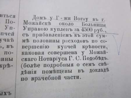 «Дом у г-жи Вогау в г. Можайске около Больницы Управою куплен за 4500 руб… с прибавлением к этой сумме половины расходов по совершении купчей крепости, каковая была совершена у Можайского Нотариуса Г.С. Подобед» (Заседание 27 апреля 1910 года).