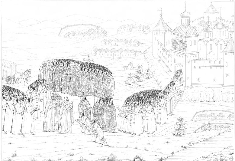 На рисунке изображена встреча в Можайске отца царя, Федора Ивановича (патриарха Филарета) Романова, возврашающегося в 1619 году из польского плена.