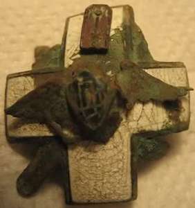 Так же, отдельные фрагменты знаков попадались копателям на этой деревне по всей территории. И один раз был обнаружен знак за окончание университетов, где вместо царского орла была припаяна красная звезда.