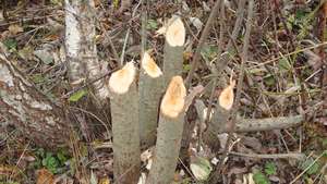 В сотне метрах ниже плотины живут бобры. Здесь они заготавливали вкусные молодые осинки.